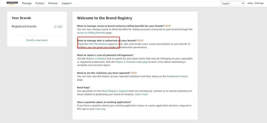 3.3 同名 同申请人 在不同国家做申请 (uk mx au 下证快,没有实审,申请费用低的国家。卖家自己考量) 申请策略组合3.1 +3.2 或者是3.1+3.2+3.3 4. TM标回执下来 ,提示可以在 亚马逊备案了 。 (先撤销 卖家店铺 原品牌的备案) 5. 原来的品牌在卖家店铺撤销, 把 同名TM商标(新的申请号)备案到卖家店铺。 或是再新建一个品牌账户B,在品牌账户B上备案,再授权给卖家店铺 二、相关实操路径&流程1. 受影响的商标,取消所有品牌授权账号 , 只留下备案账号。 链接:https://brandregistry.amazon.com/home