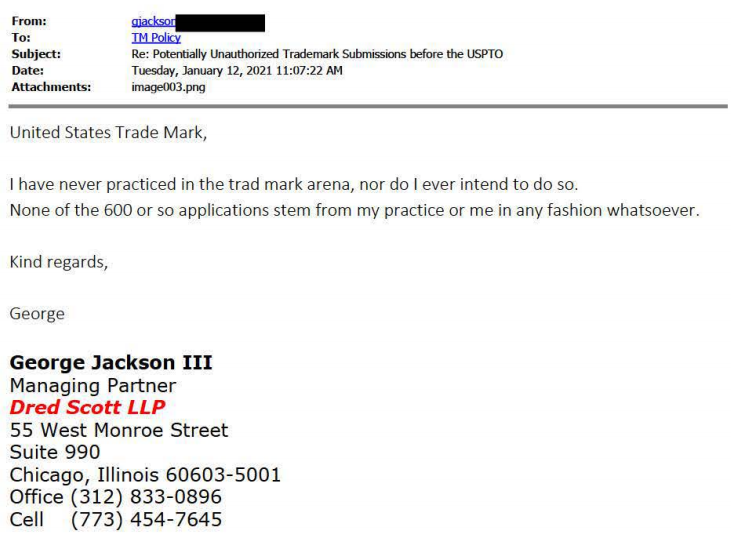 在该涉事公司委托名为"Jackson George"的律师进行商标代理,提交了上千份商标申请。经过美国商标局查验,确实有名为"Jackson George III"的美国律师,但该律师回应并未给任何商标领域申请提供代理服务。